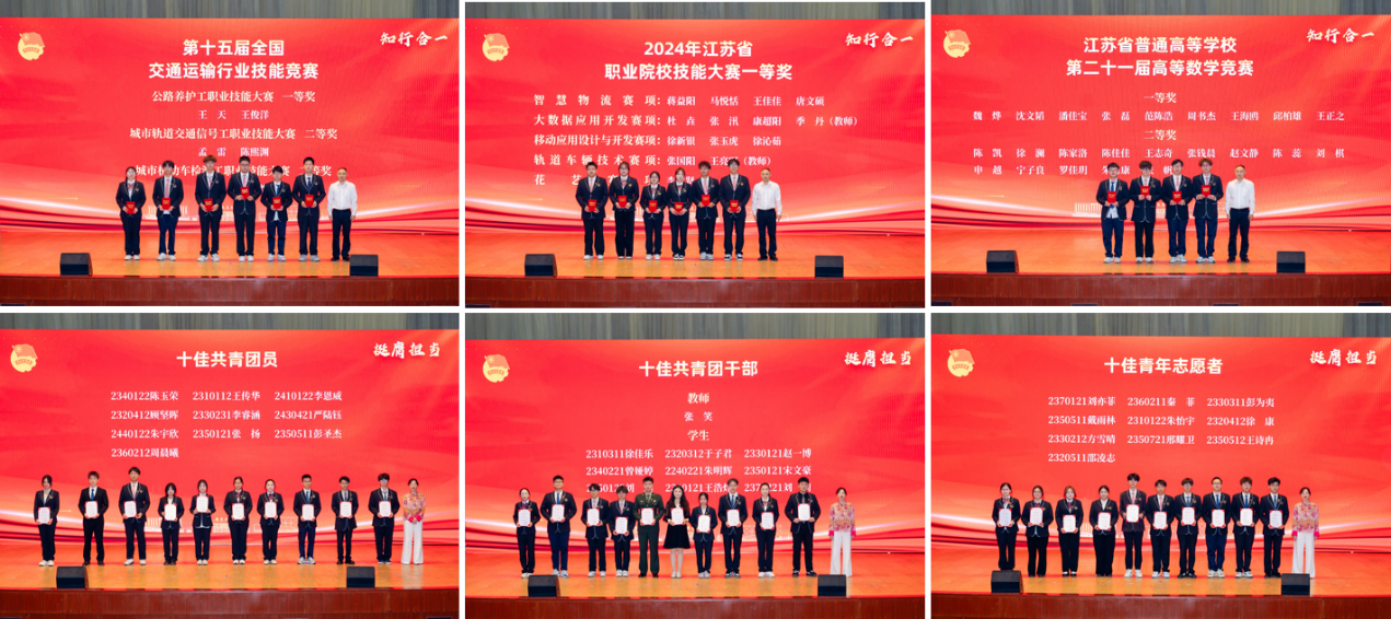 在五四表彰环节,大会以“匠心筑梦”“知行合一”“挺膺担当”三个篇章展开,对过去一年在思想引领、技能竞赛、社会实践等领域表现突出的集体和个人进行表彰。党委书记张毅、院长王道峰等领导为获奖代表颁奖。“五四红旗分团委”“江苏省先进班集体”“国家奖学金”等集体与个人荣誉表彰,彰显组织建设与学业标杆力量;全国交通运输行业技能大赛、中国国际大学生创新大赛、世界职业院校技能大赛等赛事获奖代表上台领奖,诠释“技能成才、强国有我”的青春誓言;“十佳共青团员”“十佳青年志愿者”“2024大学生年度人物”等荣誉获得者,以行动践行责任担当,传递向善力量。