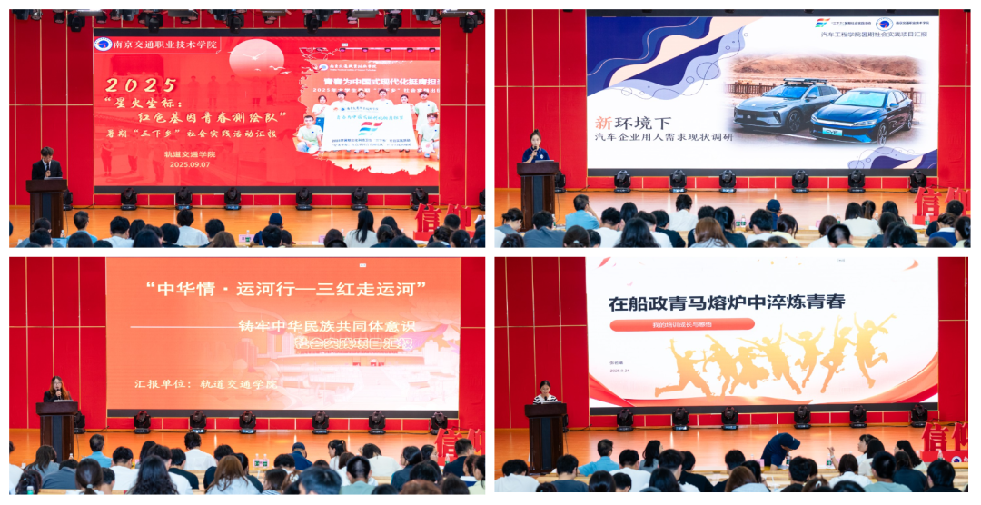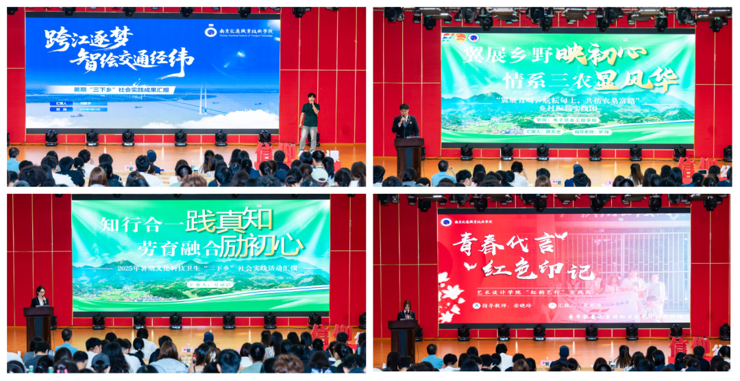 活动现场,各团队聚焦乡村振兴、基层服务、民族团结、爱国主义教育、中华文化传承、职业探索等主题,以多元形式生动展示了实践成果。汽车工程学院围绕新能源汽车产业与乡村服务,通过科技助农、心理关怀等方式助力乡村振兴与社会服务;路桥与港航工程学院融合智能建造与非遗传承,运用AIGC等技术活化传统文化,探索科技与文化结合的新方式;运输管理学院围绕交邮融合与劳动教育,深入企业与田间地头,探索城乡物流降本增效新模式,促进产业链与育人链深度融合;电子信息工程学院发挥数字技术优势,开展无人机助农与非遗数字化实践,搭建科技服务平台,以创新应用助力乡村发展与文化传承;轨道交通学院围绕红色基因传承与民族团结,通过实地研学、精品团课与民族乡村共建,深化思想引领,促进各民族交往交流交融;建筑工程学院依托专业特色,以数字技术赋能红色建筑保护,推动实践基地建设,实现红色传承与民族团结教育双融合;艺术设计学院深入红色地标开展创新传播,通过文创设计、云端课堂与直播助农,拓展红色文化表达方式,赋能乡村发展与精神传承;马克思主义学院运用全景拍摄、无人机航拍等技术实现红色资源数字化,探索“云参观”与现场教学有机融合的数字时代红色育人新路径。各学院实践团队各展所长、成效扎实,共同绘就了学院2025年暑期社会实践百花齐放的生动画卷。