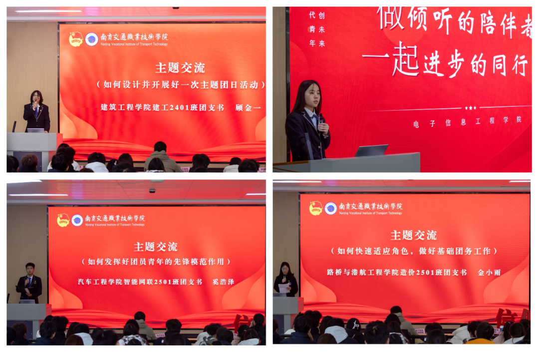 为促进经验交流、助力新生团干部快速成长,培训特别设置了主题交流环节。建筑工程学院建工2401班团支书顾金一同学分享了“如何设计并开展好一次主题团日活动”的实践经验;电子信息工程学院通信2402班陈影同学围绕“如何做好团员青年思想引领、掌握青年思想动态”作了深入交流;汽车工程学院智能网联2501班团支书奚浩泽同学则聚焦“如何发挥好团员青年的先锋模范作用”,展现了新时代团干部的责任与担当;路桥与港航工程学院造价2501班团支书金小雨同学结合自身经历,分享了“如何快速适应角色,做好基础团务工作”的实用心得。这些经验分享,为新任团支部书记提供了宝贵的工作思路与方法借鉴。