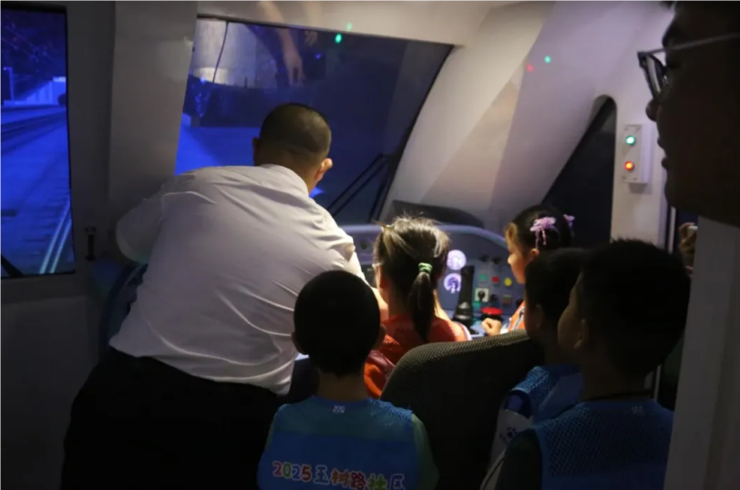 作为学院2024年重点建设的实训平台,国际多式联运虚拟仿真实训室以数字孪生技术惊艳全场。孩子们在现场展示中体验订舱、报关、多式联运路径规划等操作。在以南京地铁一号线为标准的城轨实训室中,孩子们坐进1:1还原的地铁驾驶舱。在志愿者的帮助下,他们推动操纵杆、观察仪表盘,体验列车启动、停靠的模拟操作。走进划分三大实训区的空乘实训中心,孩子们瞬间被真实还原的客舱环境所吸引。他们学习为“乘客”办理值机、托运行李,模拟客舱广播、紧急疏散等场景。