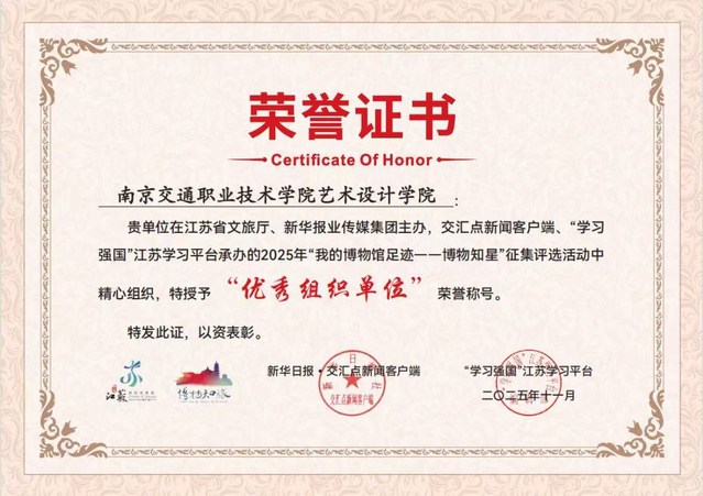 近日,在由江苏省文化和旅游厅、新华报业传媒集团联合主办,交汇点新闻客户端、“学习强国”江苏学习平台具体承办的2025年“我的博物馆足迹——博物知星”征集评选活动中,艺术设计学院凭借精心组织与深度参与,被授予“优秀组织单位”荣誉称号。