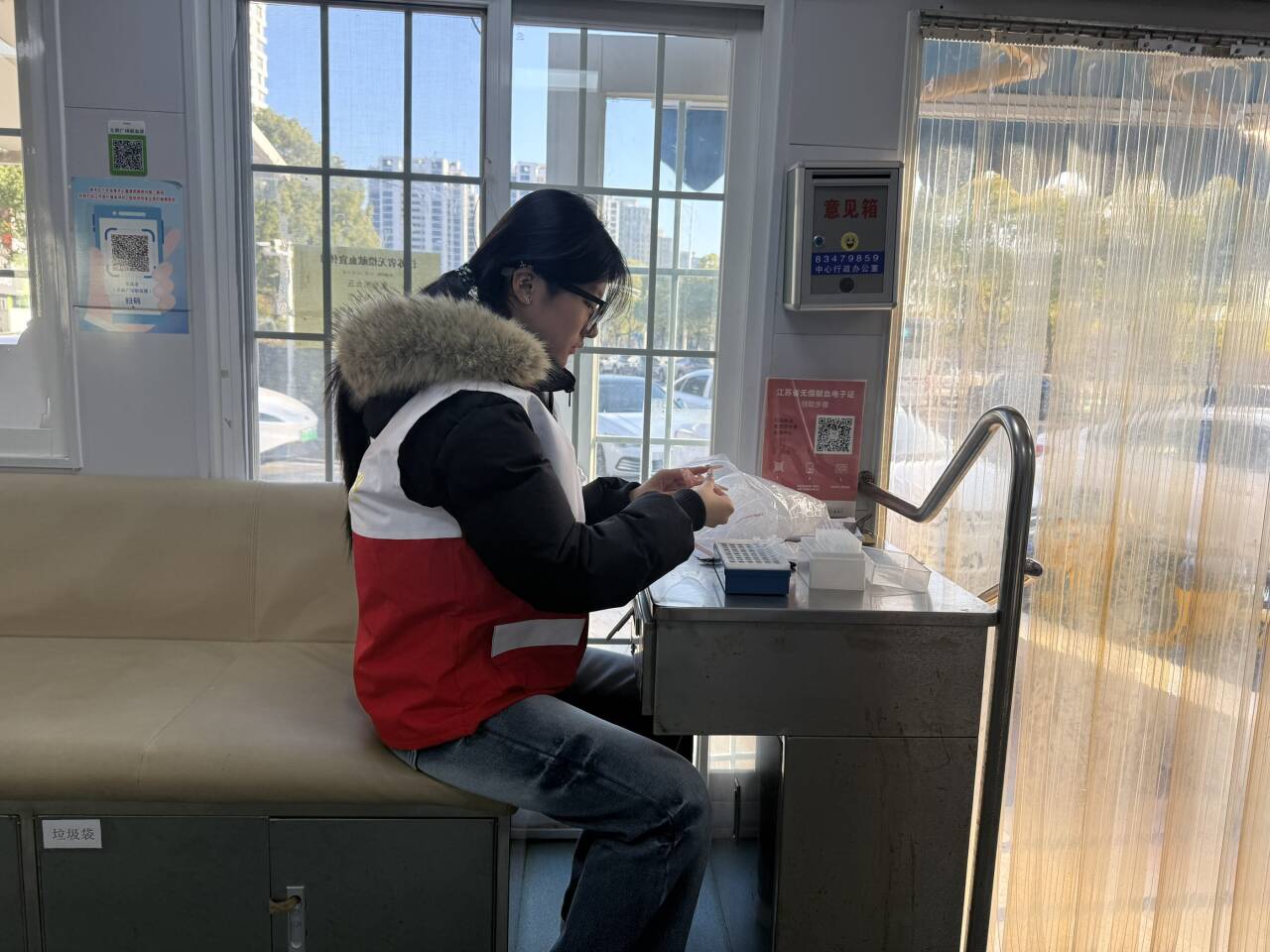 相伴而行的是,另一边的献血屋中穿着红色马甲的青年志愿者们怀揣着激动的心情,等待着每一位善意真诚的献血者。他们用温柔的话语讲述着专业的知识,缓解献血者紧张的心情。结束之后,他们献上一个轻轻的拥抱和精心准备的小礼品,以表达他们诚挚的感谢。正如鲁迅先生所说的那样:有一份热,发一分光。一袋热血,承载着生的希望;一次伸手,传递着人间的温暖。