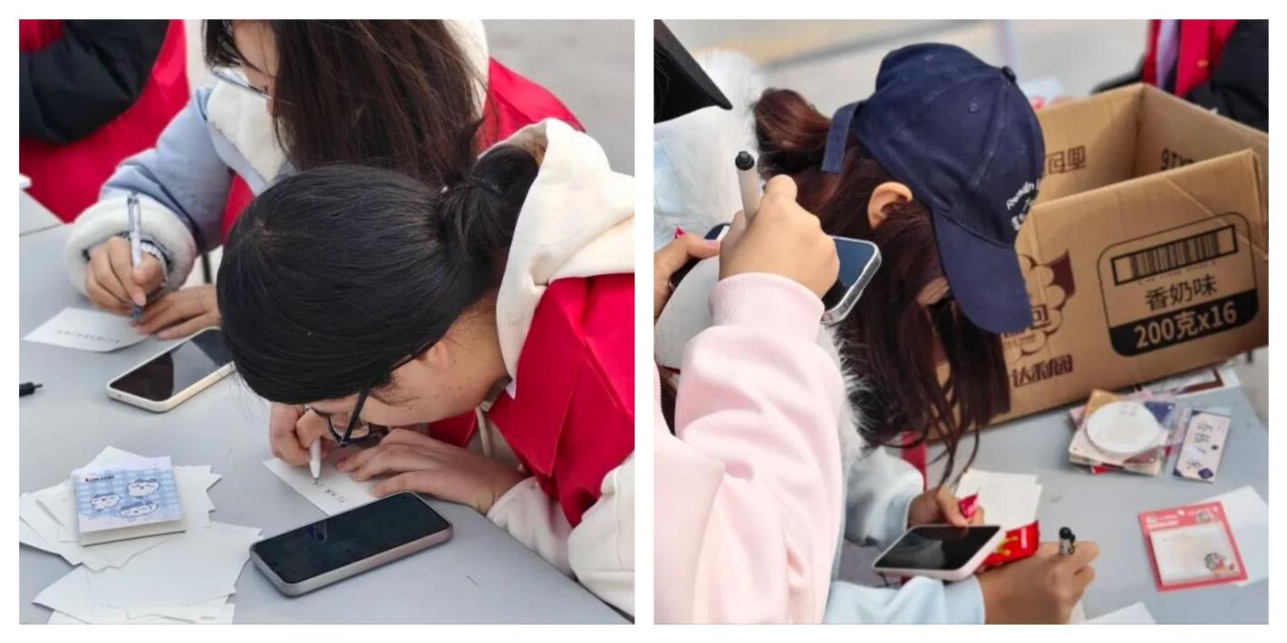 “左手传情”共情书写体验中,大家用非惯用手书写志愿寄语,为同学们写下美好祝福。