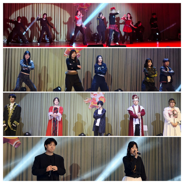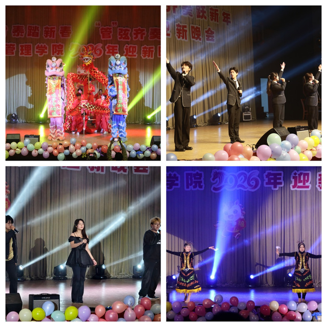 舞龙舞狮《龙腾狮跃启新程》气势恢宏,王海龙、李昭羲等表演者灵动演绎,金龙翻腾、雄狮跃动,寓意着学院发展蒸蒸日上,为晚会增添了浓厚的新春气息;朗诵《逐梦》中,顾慧娴、张乐怡等同学以声情并茂的演绎,诉说着运管学子追逐理想、不负韶华的信念与担当,引发全场共鸣。三人合唱《爱错》旋律婉转,张馨悦、季汪明、邵雨睿的深情演唱打动人心;留学生王心爱、宋梅带来的舞蹈《DAYAK》充满异域风情,展现了多元文化的魅力。