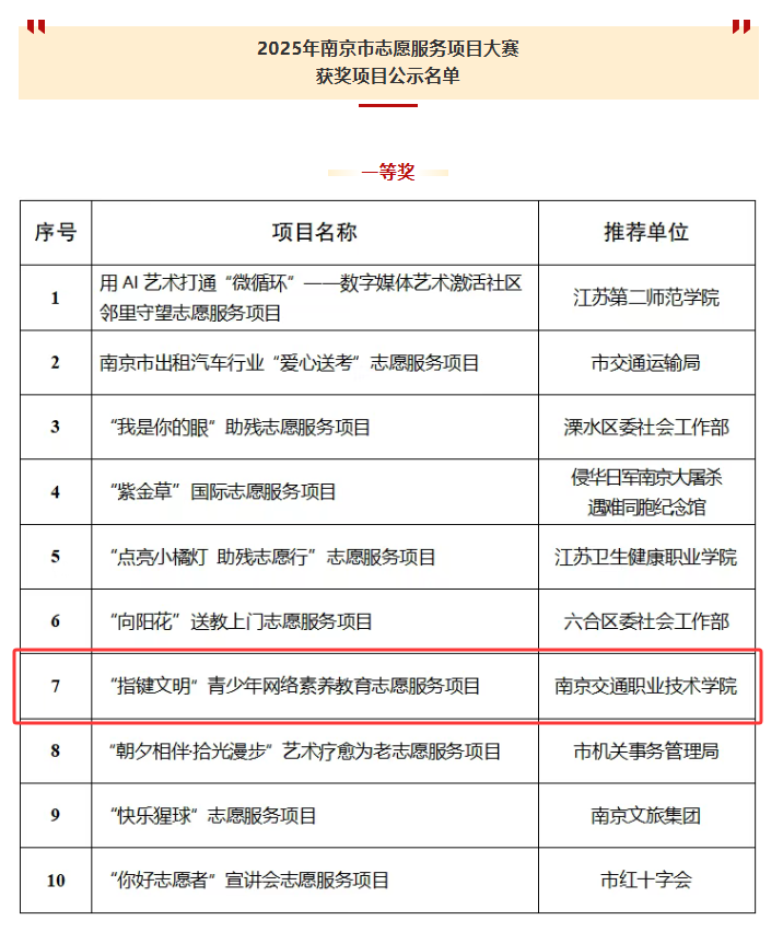 为大力弘扬志愿精神,培育志愿文化,推进志愿服务项目化、规范化、品牌化建设,由南京市委社会工作部、南京市志愿服务联合会主办的2025年度南京市志愿服务项目大赛评审结果近日揭晓。经申报推荐、资格审核、线上初评和现场路演等环节,我校建筑工程学院《“指键文明”青少年网络素养教育志愿服务项目》脱颖而出,斩获一等奖。