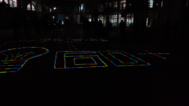 3月23日20:30分,各学生公寓相继暗淡了下来。为了配合此次活动的顺利开展,院自管会学生在思源堂广场用荧光棒摆放出“节能电灯”、“60+”和“从我做起”的字样,活动同时还播放了学生们前期录制的环保宣传短片。此外,在现场还进行了猜歌王有奖竞答和竞唱的活动,多样的活动形式引来了其他院校的学生,一起加入到了“地球一小时”的活动中,活动场面甚是热闹。