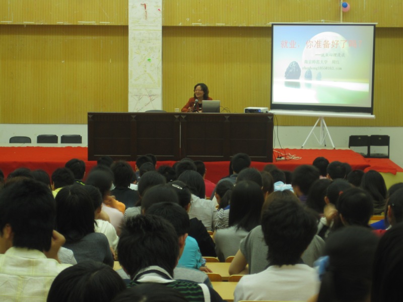 为了有效地缓解我院学生的就业心理压力,增强就业信心,树立正确积极的就业观, 5月18日晚7点,学院邀请到教育厅仙林大学城心理健康教育研究中心、南京师范大学心理健康教育咨询中心主任周红教授为学生作了大学生就业常见心理问题及辅导的讲座。约400余名学生到场聆听。