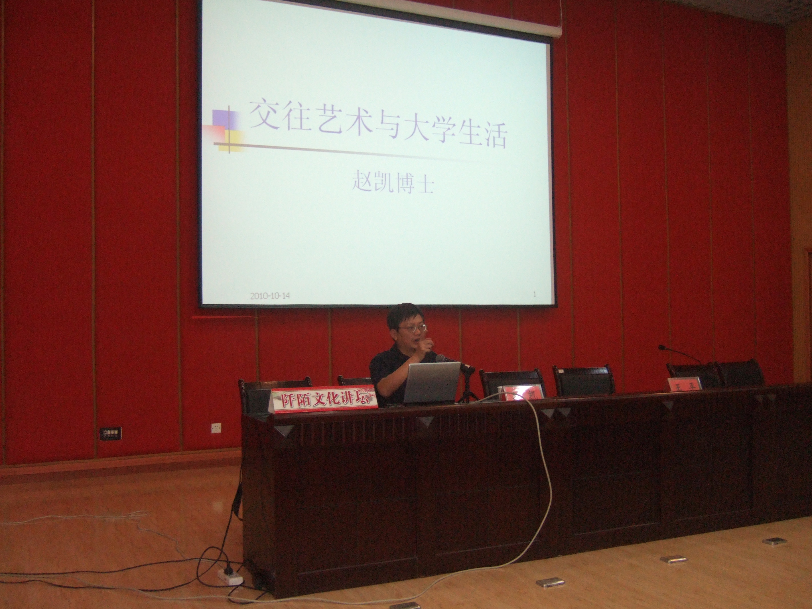 10月14日晚7点,我院阡陌文化讲坛系列讲座第一讲人际交往与大学生活在大学生活动中心226室举行,主讲人是南师大著名的心理学博士赵凯教授。励志菁英班学员及400余名学生到场聆听。