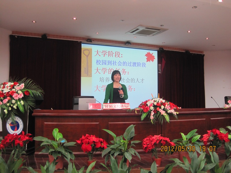 5月30日晚,2012年心理健康教育月系列讲座之“健康的自我认知:面向未来的万能钥匙”在明德楼报告厅举行,南京大学心理健康教育与研究中心谈文娟副教授主讲,300余名学生到场聆听。