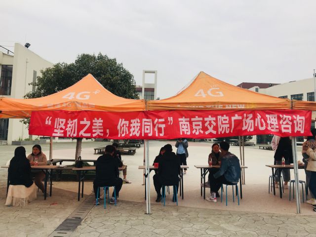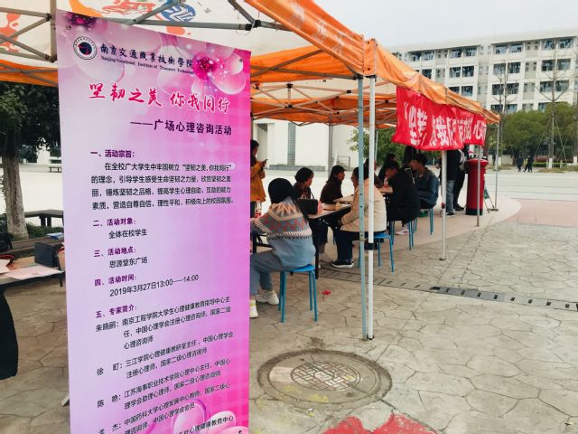 为广泛宣传和普及心理健康知识,帮助学生处理各种心理困扰,3月28日,由大学生心理健康教育中心主办的“坚韧之美,你我同行”为主题的广场心理咨询活动在思源堂广场举行。来自中国药科大学、南京工程学院、三江学院、江苏海事职业技术学院四所高校的心理中心专职教师担任本次广场咨询的专家,为我校同学疏解各种心理困惑。