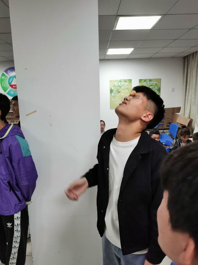 第三个环节由四个小环节组成,各部门派两对搭档登场,第一位以捏鼻俯身伸手的姿势原地转十圈,第二位同学将桌子上的一排气球吹满气,第三位完成五个呼啦圈,最后一位同学吃饼干,采用接力制,用时最短的一组获胜。看上去吃饼干似乎是最简单的一个环节,但想要快速的将难以咀嚼的饼干吃完,却也不是件容易的事情。而第一步转圈圈的同学,有些直接转到晕头转向,已经远远超出了十圈而不自知,最后被其他队员扶下了场。同学们为了部门的荣誉,也是够拼的。