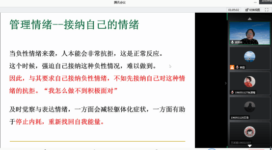 6月10日下午,我校“逆境携行,你我同心”525心理健康月系列主题活动之助力复学线上讲座——《如何做一个情绪成熟的人》在腾讯会议顺利举行。此次讲座,我们邀请东南大学心理健康教育中心郭晋林教授主讲,共有一百多名师生代表参加了讲座,反应热烈。郭老师学识渊博,视角独特,在讲述情绪的相关内容时,引入大量的生活实例,深入浅出,使同学们有更加直观形象地感受情绪的调节与管理。