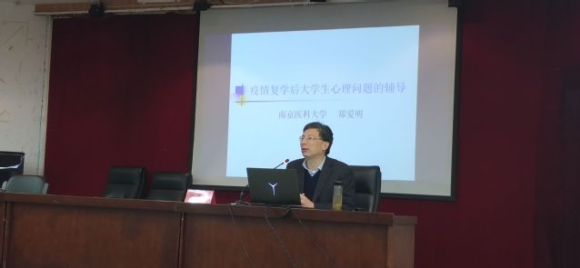 会上,强调了辅导员理论学习和心理健康教育的重要性和必要性,明确了“学校-院(系)-班级-宿舍-家庭”五级心理健康网络的职责;对过去一年学生心理健康教育工作进行了总结,表彰了优秀心理委员。会后,江苏省大学生心理健康教育研究中心(江宁基地)主任、南京医科大学马克思主义学院副院长郑爱明教授做了《疫情复学后大学生心理问题辅导》的讲座。