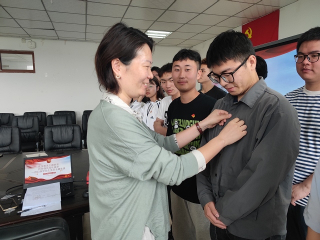 王琼副书记为毕业生党员佩戴党徽,激励党员时刻警醒自我、服务群众、奉献社会。王雪琴老师带领全体毕业生党员重温入党誓词。铮铮誓言铿锵有力,庄严承诺掷地有声,激励全体毕业生党员踔厉奋发,勇毅前行。