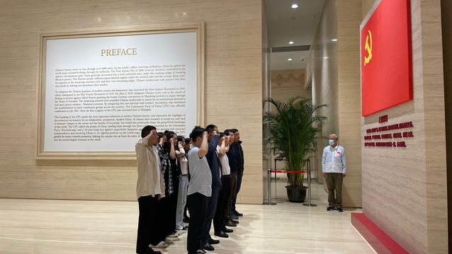 参观完中共二大会址纪念馆后,教师党员们来到中共一大纪念馆,面对党旗,党建筑工程学院党总支书记陈晋中领誓,教师党员们庄严举起右手,重温入党誓词。伴随着讲解员的娓娓道来,教师党员们一一走过那饱含着历史记忆的展品,通过“前仆后继、救亡图存”“民众觉醒、主义抉择”“早期组织、星火初燃”等多个板块的参观和浸润式学习,对党史有了更为鲜活的了解,也更真切体悟到伟大的建党精神和中国共产党人始终不忘的初心使命。
