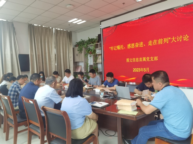 根据学校党委主题教育安排,5月30日上午,图文信息直属党支部组织开展“牢记嘱托、感恩奋进、走在前列”大讨论,全体党员、内设机构负责人参加,由党支部副书记胡友好主持。