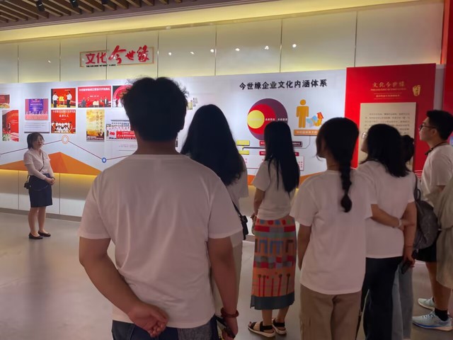 在今世缘集团讲解员的带领下,师生们依次参观了展示中心—智能化酿酒车间—白金酒库—包装中心—今世缘等着我—高沟酒非遗保护区。这不是传统意义上的旅游景区,它承载着一个企业的文化传承和精神力量。通过讲解员的介绍,大家了解到今世缘集团“因缘而生,随缘而盛”的创业之路:1996年的浴火重生,历经小步快跑、弯道超车、华丽转身、转型发展,今世缘人以缘载道,以缘立誉,走向众芳之所在。回望这一段艰辛的创业历程,栉风沐雨、披荆斩棘,初心历久弥坚。大家从中真切地感悟到:艰难困苦,玉汝于成;创业维艰,奋斗以成!