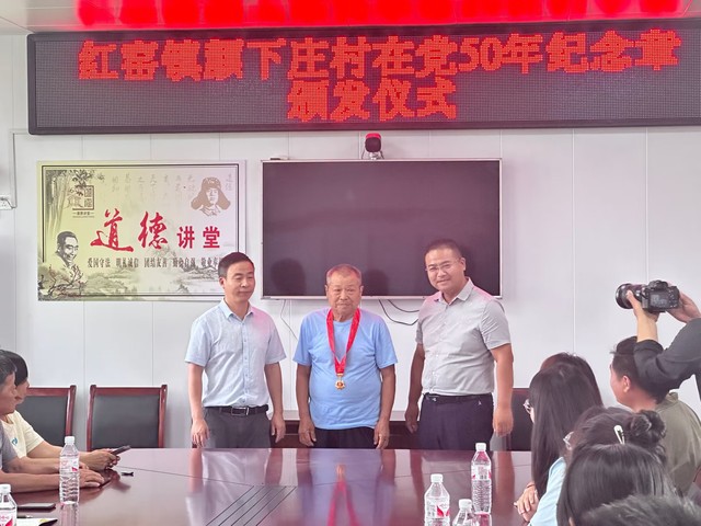 在中国共产党建党102周年华诞来临之际,人文艺术系“研学筑梦,一路生花”乡村振兴实践团的师生们有幸见证了颜下庄村“光荣在党50年”纪念章颁发的光荣时刻。“光荣在党50年”纪念章,凝聚着党和人民对老党员的感激之情,承载着老党员的光荣与担当,既是对党员不忘初心的诠释,也是对党员增强“四个意识”、坚定“四个自信”,做到“两个维护”的有力鞭策。在场的师生们无不深受感触,纷纷表示在党50年,风雨50载,从满头青丝到银发生辉,老去的是岁月,不变的是对党的忠诚。而作为新时代的中国青年,要学习老党员前辈们“一颗红心永向党”的政治品格、“以身示范敢为人先”的担当魄力和“撸起袖子加油干”的奋斗精神,继承和发扬老党员的爱党爱国之情与踏实奋斗的历史积淀,把初心和使命铭记于心、践之于行!
