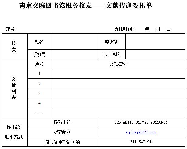 南京交院图书馆服务校友——文献传递委托单