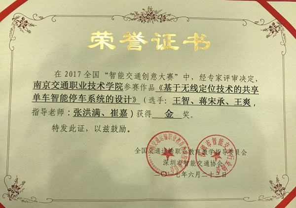 6月22日至23日,2017全国“智能交通创意大赛”在深圳会展中心举行。运输管理学院交通运营管理专业王智、蒋宋承、王爽的作品《基于无线定位技术的共享单车智能停车系统的设计》(指导教师:崔嘉),凭借独到的创意和特色荣获2017全国“智能交通创意大赛”金奖。