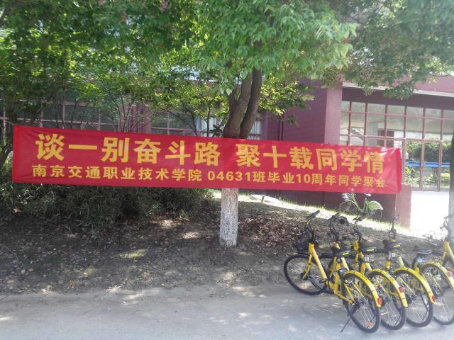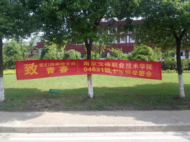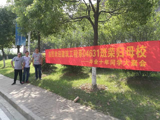 久别重逢非少年,执杯相劝莫相拦。 前夜酒虽甚多,但不影响第二天的活动安排,因为心中有爱,所以早上八点就赶到母校。十年变化,沧桑不曾发芽,青春却仍伸枝桠,校内校外多了许些建筑,母校更显青春活力。我们把事先做好的横幅挂在校园的主干道和教学楼下,方便老同学会合,倍增亲切感!