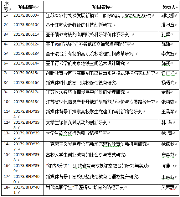 近日,2017年度江苏省高校哲学社会科学研究基金项目和专题项目立项结果公布,学院共有18个项目获批。其中10项基金项目,8项思政专项项目,立项数量较往年有较大提升。
