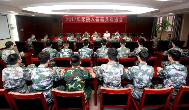 9月6日下午,学院隆重举行2017年应征入伍新兵欢送会。南京市江宁区委常委、区人武部部长张荣,学院党委副书记许正林出席会议。学工处(武装部)、相关二级学院党总支负责同志以及全体入伍新兵参加了欢送会。