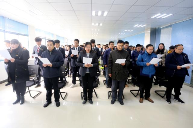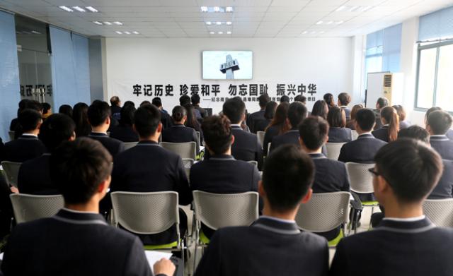 上午,师生代表在学院团干部教育基地集中观看了南京大屠杀死难者国家公祭仪式。党委书记贾俐俐,副书记许正林,党委宣传部、保卫部、素质教育中心、团委负责人和团学干部代表共同参加。公祭仪式开始前,全体师生集体诵读了《和平宣言》。按照公祭仪式的议程,全体师生高唱国歌,并向死难同胞默哀。公祭仪式结束后,学生代表宣读了主题为“勿忘国耻 振兴中华”的倡议书。