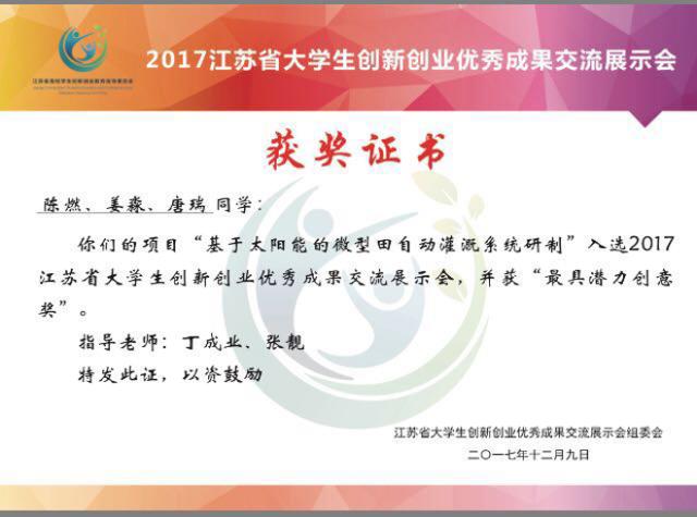 2017年12月,江苏省大学生创新创业优秀成果交流展示会在南京工业大学江浦校区拉开序幕,学院明德班学生“基于太阳能的微型田自动灌溉系统研制”专利作品经组委会遴选获邀参展。作品负责人陈燃、姜淼同学在展示会现场为观展人员讲解及演示,得到在场领导老师与各兄弟院校同学的高度关注与认可,该作品被组委会授予“最具潜力创意奖”。