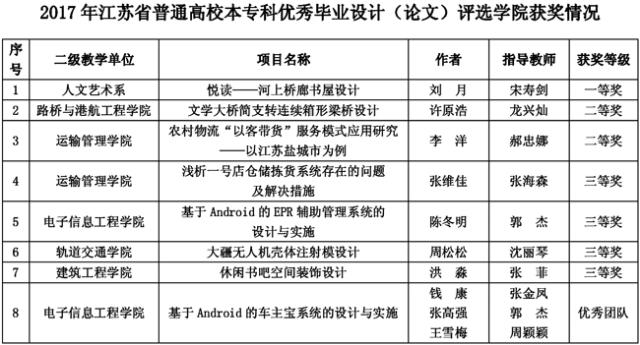 日前,江苏省教育厅公布了2017年江苏省普通高等学校本专科毕业设计(论文)评优结果,学院学子优秀毕业设计(论文)在全省评优中再创佳绩,其中一等奖1项;二等奖2项;三等奖4项;优秀团队1项。