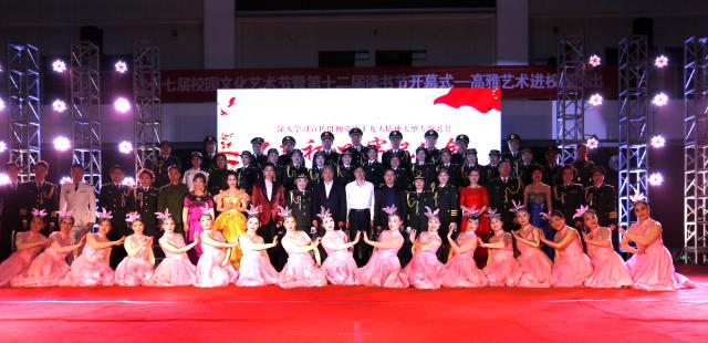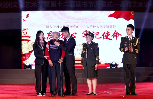 参加开幕式演出的江苏战旗军旅文工团演员均为红军、新四军、八路军后代,平均年龄已60多岁,他们的敬业精神、对艺术的执着追求和对革命先辈精神的精彩演绎感动了全场观众。演出以歌舞《你是一面旗帜》开篇,朗诵《春天的故事》、舞蹈《共产党员向前冲》、快板《天安门广场看升旗》、歌曲《不忘初心》等精彩的节目深深感染了观众。曾参加过长征,三过草地、两过雪山,经历土地革命战争、抗日战争、解放战争现已106岁高龄的红军老战士秦华礼老人寄语全院青年学子要努力学习,不忘初心,永远跟党走。老艺术家们以精湛的舞台艺术给师生上了一堂爱国主义教育课。