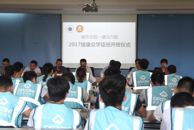 5月16日下午,南京交院—康众汽配2017级康众学徒班举行开班仪式。学院副院长杨益明,江苏康众汽配有限公司副总裁谈春林、华中大区经理闫海林、人事行政经理黄家强出席。教务处、校企合作办、汽车工程学院、运输管理学院等部门负责同志,2017级“康众学徒班”校企班主任以及全体75名同学参加。开班仪式由运输管理学院院长吕亚君主持。