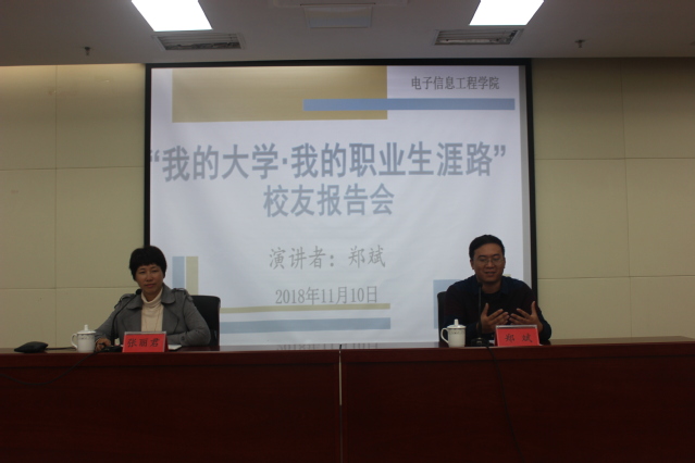 2018年11月10日,电子信息工程学院在图书馆B203举行了“我的大学,我的职业生涯路”优秀校友报告会。此次报告会邀请了我院2005级校友、南京凯基特电气有限公司总经理郑斌主讲,他与在校生一起回忆了三年的大学学习生活,以及创业的艰辛奋斗历程。