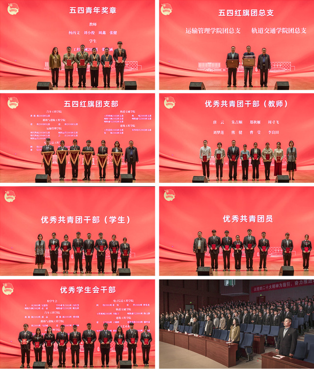 大会第一阶段为学院团干思政大比武获奖团课展示,路桥与港航工程学院费依涵《夜空中最亮的星》、轨道交通学院杨心怡老师《用好红色资源赓续红色血脉》作为优秀团课代表用贴近青年的语言和表达,激发青年学生听党话、跟党走,将个人小我融入祖国大我,迅速成长为合格的交通事业建设者;第二阶段为“传承五四薪火 不负青春时光”五四表彰大会,党委周传林副书记宣读了表彰文件,与会领导为先进集体和个人颁奖。运输管理学院周寸飞老师代表先进集体发言,建筑工程学院丁储彬同学代表优秀共青团员发言,新老团员一起重温了入团誓词。