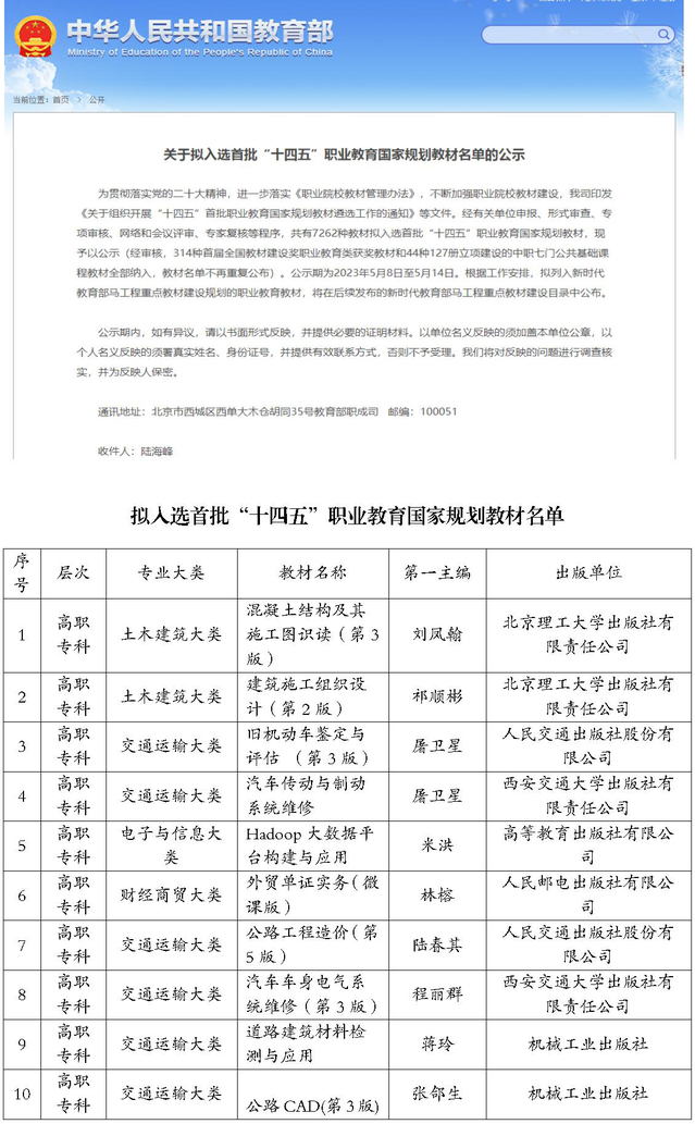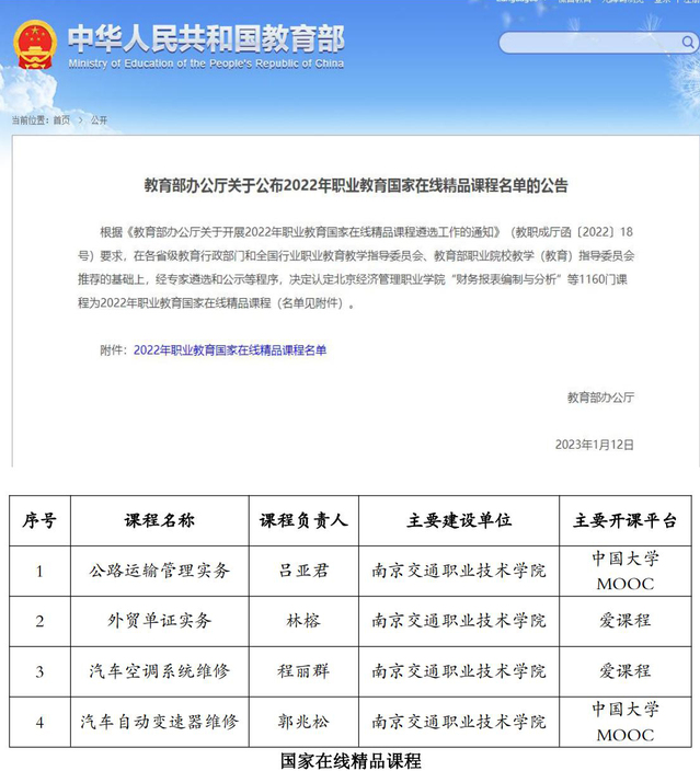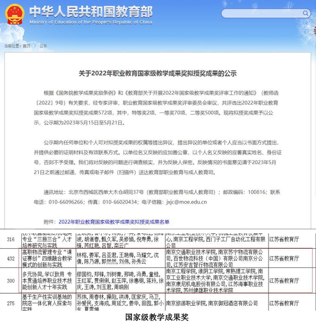 绿槐高柳咽新蝉,薰风初入弦。5月14日,2023年职业教育活动周全国启动仪式暨全国职业院校技能大赛在山东潍坊拉开帷幕,2023年全国职业院校技能大赛正式打响,南京交院代表队在“汽车故障检修”赛项中勇夺江苏首金。伴随着现代职业教育体系建设新模式的不断探索,教育教学改革持续推进,校企合作产教融合不断深入,今年学院教育教学改革涌现了一批国家级成果:4门课程入选国家在线精品课程,10本教材入选首批“十四五”职业教育国家规划教材,2项教学成果荣获国家级教学成果二等奖。