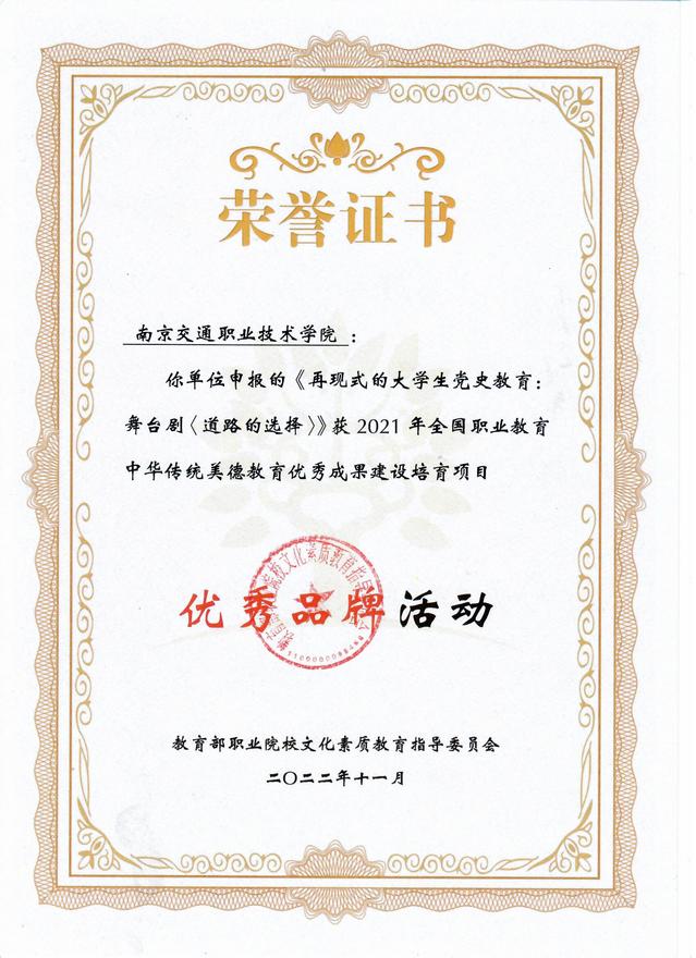 近日,教育部职业院校文化素质教育指导委员会公布2021年全国职业教育中华传统美德教育优秀成果建设培育项目评比结果,学校申报的《再现式大学生党史教育:舞台剧﹤道路的选择﹥》荣获全国职业教育中华传统美德教育优秀成果建设培育项目“优秀品牌活动”。