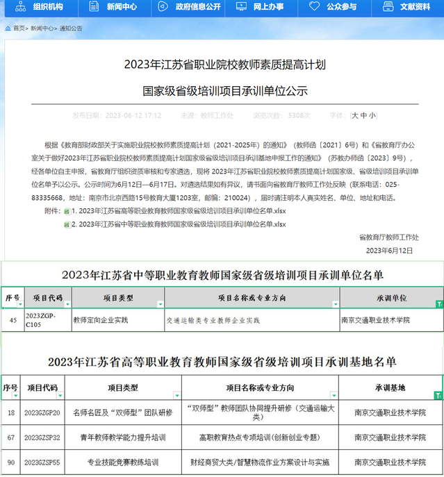 近日,根据省教育厅公布的2023年江苏省职业院校教师素质提高计划国家级省级培训项目承训单位名单,学院获批2023年江苏省中等职业教育教师国家级培训项目承训基地1项,高等职业教育教师国家级培训项目承训基地1项、省级培训项目承训基地2项,这是学院首次获批高等职业教育教师国家级省级培训项目承训基地。