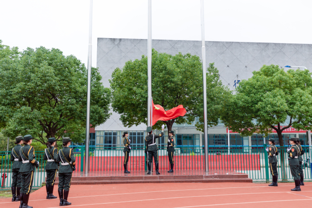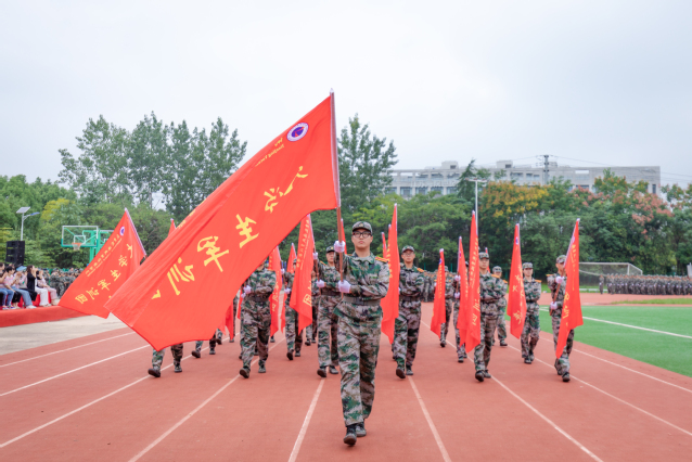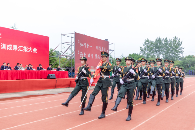 学院国旗护卫队举行了庄严的升国旗仪式,五星红旗伴随着雄壮的国歌声冉冉升起,2023级新生军训成果汇报表演正式拉开帷幕。