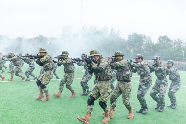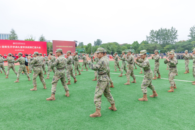 张毅书记下达“按计划进行”命令后,19个徒手方队在以军训团旗为首的战旗方队引领下,伴着庄重威严的分列式进行曲,意气风发、豪情满怀地依次从主席台前走过,接受检阅。嘹亮的口号响彻万里云霄,整齐的步伐踏出青春风采,坚定的眼神彰显铮铮铁骨,交院学子们意气风发,斗志昂扬。汇报表演环节,组字表演、男生刺杀操、女生匕首操、教官格斗术、战术综合演练等表演方阵依次亮相,他们精神抖擞、英姿飒爽、动作利落、气势飞扬,赢得了全场师生热烈的掌声和一致好评。
