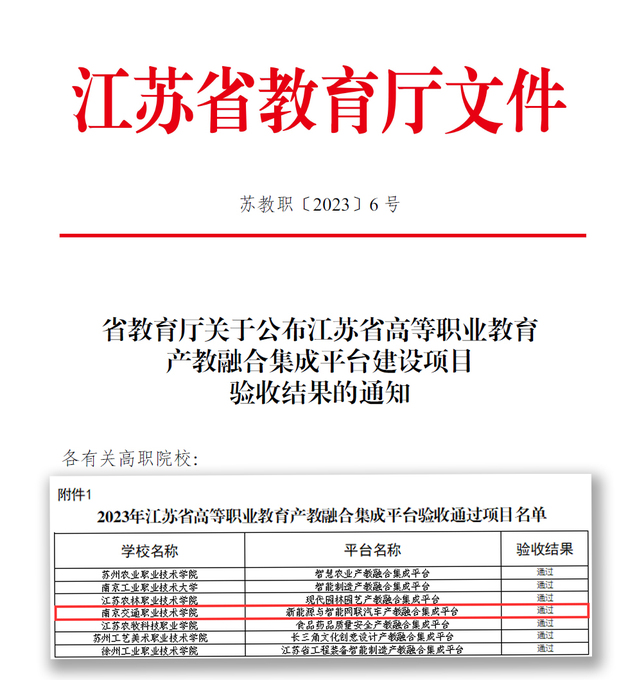 近日,江苏省教育厅公布了省高等职业教育产教融合集成平台建设项目验收结果(苏教职〔2023〕6 号),南京交通职业技术学院“新能源与智能网联汽车产教融合集成平台”顺利通过验收。