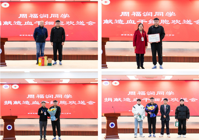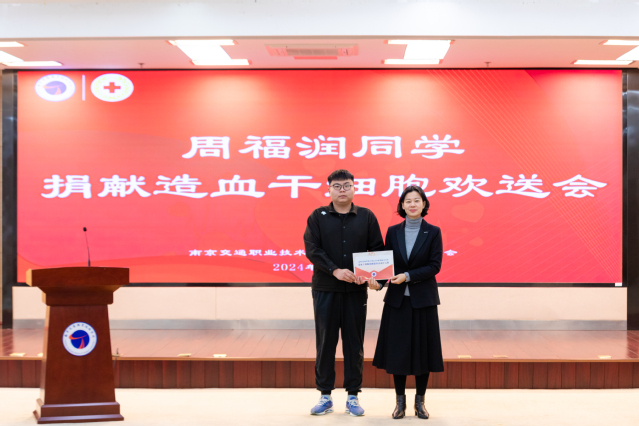 周福润,运输管理学院冷链2101班学生,2022年4月加入造血干细胞志愿者资料库,2023年9月与患者配型成功(患者1997年出生,女性,身患急性白血病)。周福润将是江宁区第23位(南京市第178位)成功捐献造血干细胞志愿者,2024年南京市第1例造血干细胞捐献者,也是学院第一例捐献造血干细胞的志愿者。欢送会上,周福润同学分享了自己决定捐献造血干细胞的心路历程,表达了自己用行动诠释新时代交院青年责任担当的决心。