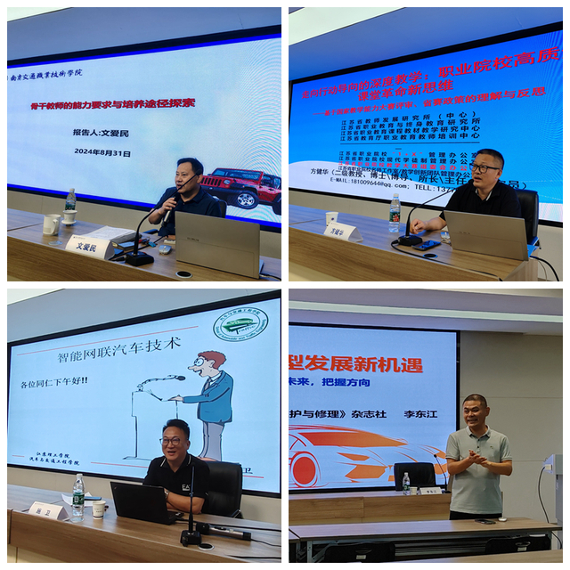 江苏省教育科学研究院教师发展研究所所长方健华为学员们作《职业院校高质量教学革命新思维》讲座,通过解读《职业教育法》,分析高质量课堂的实现路径,通过理念、模式、方法的转变,实现真正的课程革命;江苏省中高职院校技能大赛交通大类专家组长、江苏省汽车技术专业委员会副主任施卫,《汽车维护与修理》杂志社主编李东江,开沃新能源汽车集团股份有限公司高级工程师、产品研发中心负责人叶毅雯,南京金陵高等职业技术学校汽车系主任刘娟娟等校外专家,南京交通职业技术学院党委副书记文爱民,汽车工程学院院长陈林山、马克思主义学院院长赵勇、科研处副处长郭兆松等校内专家,分别作了关于智能网联汽车技术、汽车后市场发展趋势对职业教育的影响、骨干教师的培养、二十届三中全会精神解读等系列专题讲座和经验交流研讨。汽车工程学院郭彬、陈生枝、万彤、王海亮等老师带领学员分别开展了智能网联汽车故障检修等理实一体培训。