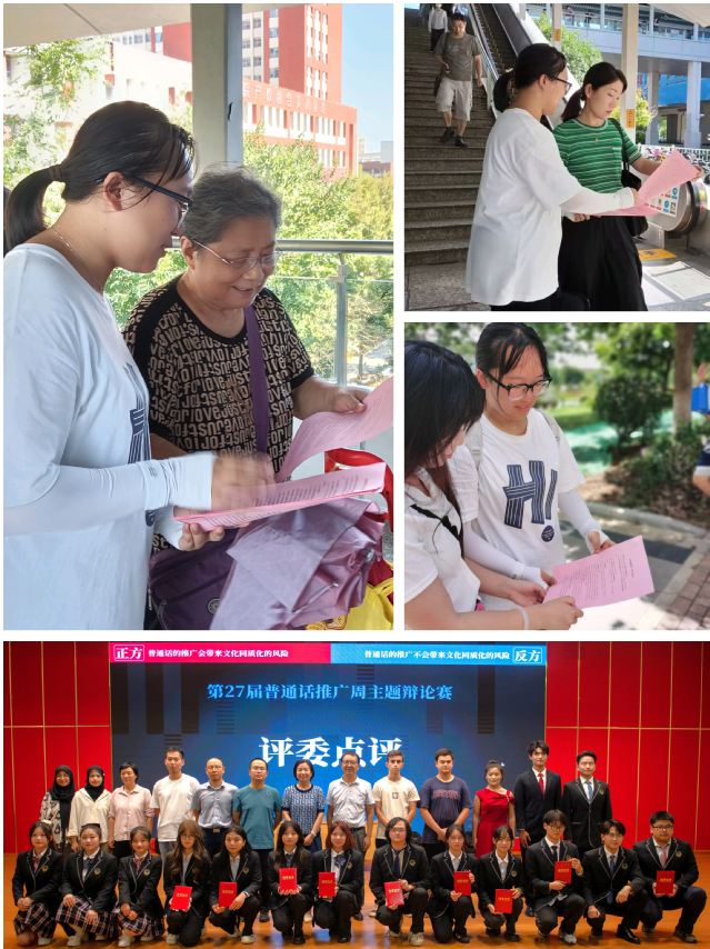 活动多样、多“员”融入,展现汉语言魅力。推普周期间,相继开展了“广场推广”“主题辩论”“有奖竞读”“诗歌朗诵”等推普活动。活动不仅提高了中国学生使用国家通用语言文字的意识和能力,还吸引了在校留学生的积极参与。学生们纷纷表示,参加推普周活动,加强了对中国语言文字规范化工作重要性的认识,提高了说普通话、写规范字的能力,也增进了中外语言文化交流和情感沟通。