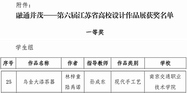 近日,“融通并茂——第六届江苏省高校设计作品展”获奖名单正式公布,建筑工程学院教师孙成东指导学生林梓童、陆禹诺的参赛作品《乌金大漆茶器》采用非遗大漆技艺与现代茶器相结合,结合天地人的设计理念,表现宇宙、银河、航空的主题图案,在众多参赛作品中脱颖而出并获得学生组一等奖。