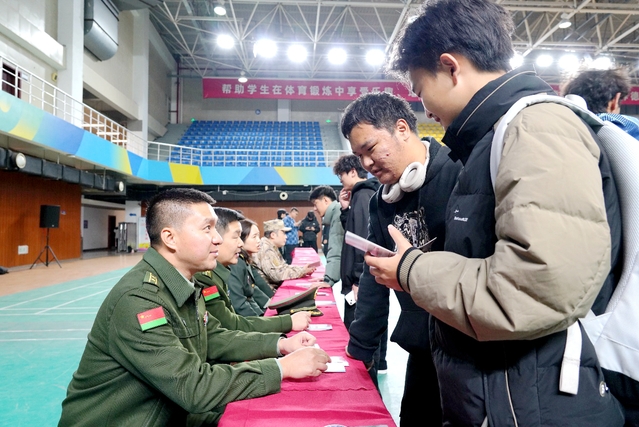 为进一步增强广大学生的国家观念和国防意识,点燃他们携笔从戎、报效国家的热情,12月4日下午,学院联合江宁区人武部在行健馆开展2025年春季征兵宣传进校园活动,学院党委委员、副院长刘雪芬,江宁区人武部副部长车军良亲临现场,为有志参军的学生提供咨询与指导。