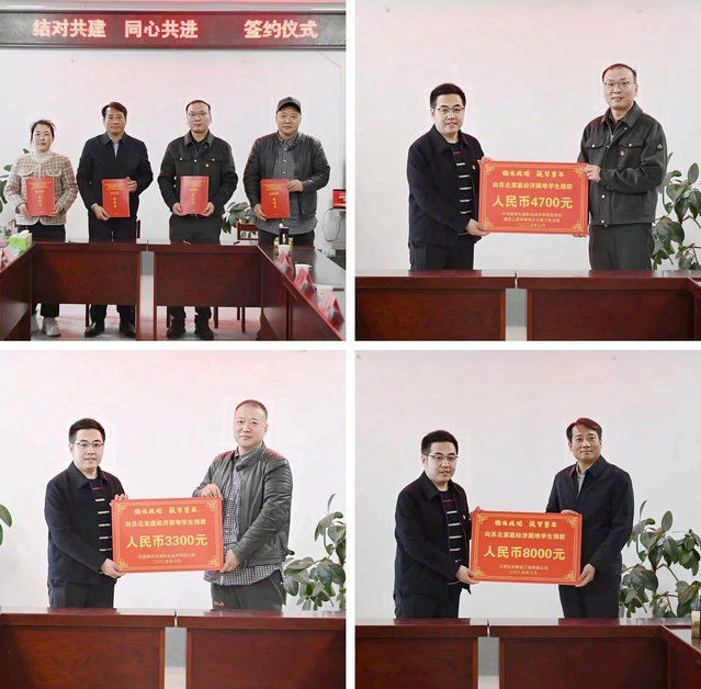 在随后的交流座谈中,与会人员共同观看了南京交通职业技术学院的宣传片,深入了解学院在人才培养、社会服务等方面的成果。周码村党支部书记张海艳简要介绍了周码村的基本情况和发展现状。建筑工程学院党总支负责人感谢工作队及周码村党支部为学院搭建了一座爱心传递的桥梁,并表示学院将充分发挥教育资源优势,持续支持乡村振兴工作,为地方经济社会发展贡献力量。民盟南京交通职业技术学院支部主委、建工学院装饰教研室负责人,江苏弘创建设工程有限公司总经理赵坚分别表达了进一步参与乡村振兴、助力涟水农村教育事业发展的意愿。活动期间,建筑工程学院与周码村签订了共建协议,各方将在党建共建、教育帮扶、人才培养等方面开展深度合作,共同推动乡村振兴事业迈上新台阶。与会人员还集体走访慰问了2名重点资助学生,深入了解他们的实际困难,并为他们送上了生活用品和学习物资,鼓励他们勇敢追梦,努力成为对社会有用的人才。