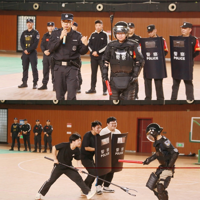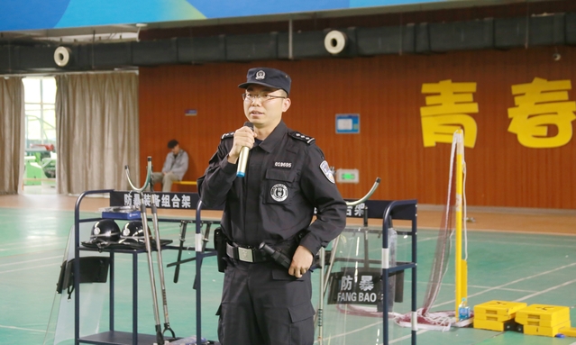 实操技能培训环节,王俊详细讲解示范了警棍、钢叉、盾牌等器械的使用方法,指导盾牌攻防技术及钢叉的配合使用等技能,介绍和演示了暴恐袭击现场的控制、抓捕和解脱,演示了擒拿防身术,现场部分安保、宿管人员还积极参与了互动演练。