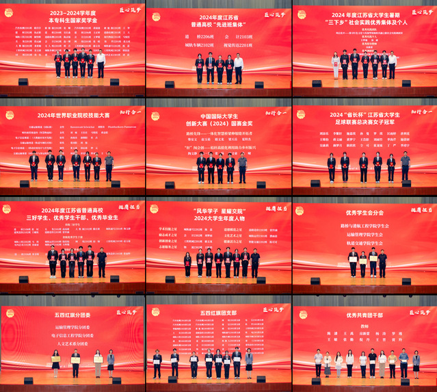在五四表彰环节,大会以“匠心筑梦”“知行合一”“挺膺担当”三个篇章展开,对过去一年在思想引领、技能竞赛、社会实践等领域表现突出的集体和个人进行表彰。党委书记张毅、院长王道峰等领导为获奖代表颁奖。“五四红旗分团委”“江苏省先进班集体”“国家奖学金”等集体与个人荣誉表彰,彰显组织建设与学业标杆力量;全国交通运输行业技能大赛、中国国际大学生创新大赛、世界职业院校技能大赛等赛事获奖代表上台领奖,诠释“技能成才、强国有我”的青春誓言;“十佳共青团员”“十佳青年志愿者”“2024大学生年度人物”等荣誉获得者,以行动践行责任担当,传递向善力量。