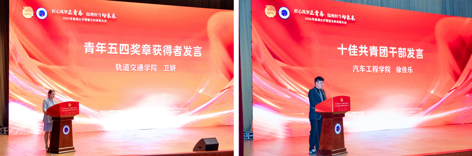 “十佳共青团干部”徐佳乐同学、“青年五四奖章”获得者卫妍老师分别作为获奖代表发言,分享了立足专业、勇担使命的青春故事。