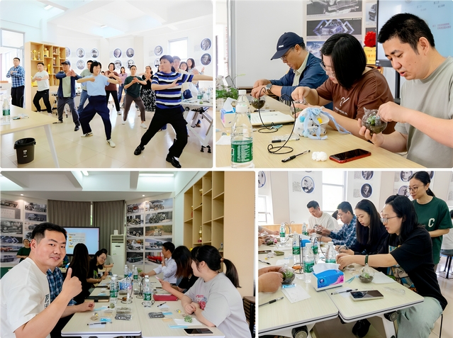 “压力释放体验”环节,辅导员们专注于手中的材料,精心搭建属于自己的微型生态世界:一铲一土、一花一草的搭配,让大家暂时放下了工作的繁杂,在沉浸式创作中感受内心的平静。八段锦教学,更是让辅导员们在舒缓的动作中舒展身心:在专业的讲解与示范下,大家跟随节奏缓缓舞动,在一呼一吸间释放压力,体会传统养生功法带来的身心调和。